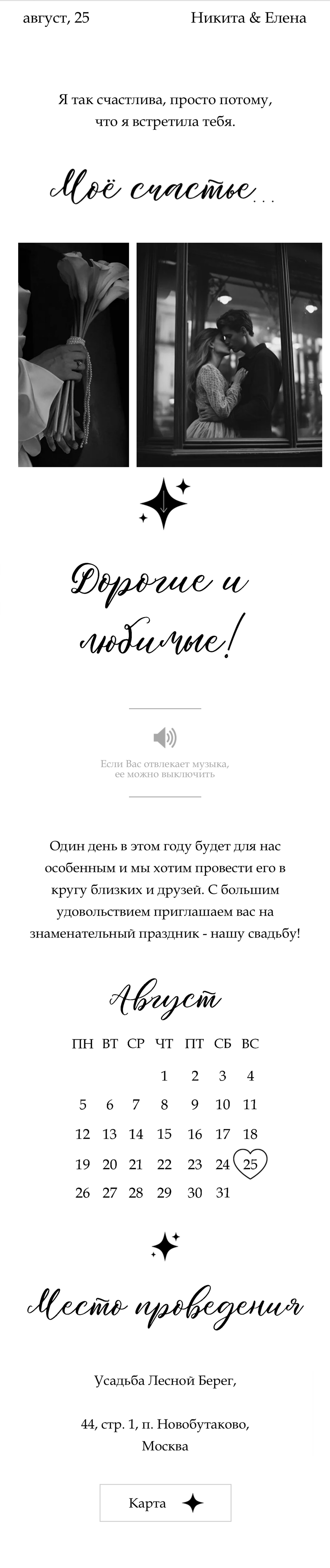 Полноценный свадебный сайт Вы получите ссылку на полноценный свадебный сайт, в котором можно включить музыку, разместить опрос для гостей, контакты, фото галерею, дресс-код, карту расположения, таймер отсчета до торжества и многое другое! 💬 Ответы на опрос от каждого гостя придут сразу же на почту.